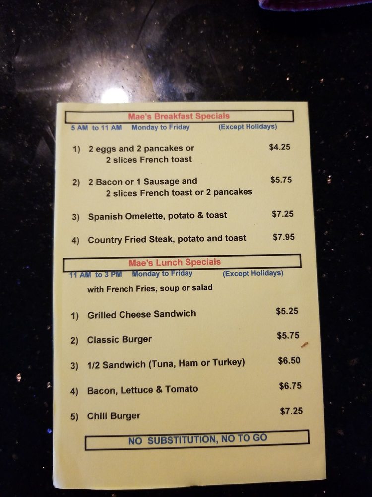 With good customer service, a welcoming environment, and even catering options, Mae’s Cafe continues to be a beloved breakfast spot, promising a memorable experience whether you're dropping in for a quick bite or a leisurely meal.